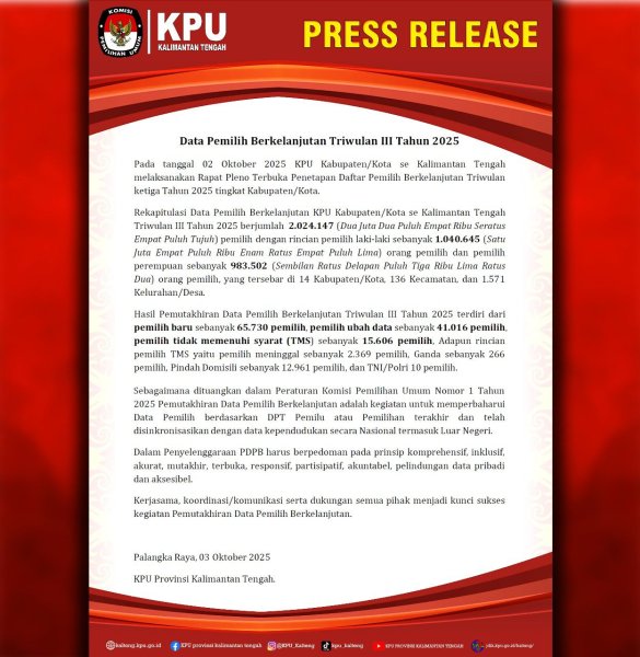 KPU Provinsi Kalimantan Tengah melalui press release ini ingin menginformasikan mengenai Data Pemilih Berkelanjutan Triwulan III Tahun 2025 yang diperoleh dari Rekapitulasi Data Pemilih Berkelanjutan KPU Kabupaten/Kota Se - Kalimantan Tengah. ....