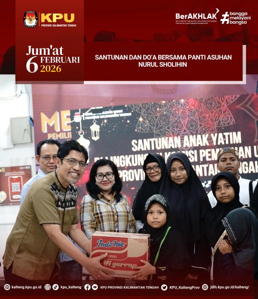 Komisi Pemilihan Umum Provinsi Kalimantan Tengah melaksanakan kegiatan Santunan dan Doa Bersama Panti Asuhan Nurul Sholihin, bertempat di Aula RPP KPU Provinsi Kalimantan Tengah pada Jumat, 06 Februari 2026. Kegiatan Peduli Anak Yatim untuk menyambut Bulan Suci Ramadhan di Lingkungan KPU, merupakan bentuk kepedulian Komisi Pemilihan Umum terhadap generasi bangsa dan memperat tali silaturahmi serta meningkatkan solidaritas antar sesama. Adapun kegiatan dibuka oleh Kadiv Perencanaan, Data dan Informasi Wawan Wiraatmaja, serta sambutan dari Pimpinan Yayasan Panti Asuhan Nurul Sholihin. Turut Hadir Anggota KPU Provinsi Kalimantan Tengah Dwi Swasono, Harmain, Tity Yukrisna, Wawan Wiraatmaja. Plh. Sekretaris KPU Provinsi Kalimantan Tengah Toni Sadoso Saputra, Kabag, Kassubag dan Jajaran Sekretariat KPU Provinsi Kalimantan Tengah. ....