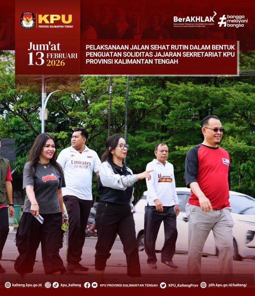 Komisi Pemilihan Umum Provinsi Kalimantan Tengah Kembali melaksanakan Jalan Sehat Rutin di Bulan Februari, Jalan Sehat yang dilaksanakan rutin setiap bulan ini bertujuan untuk memperkuat soliditas dan memperat Kerjasama diantara Jajaran Sekretariat KPU Provinsi Kalimantan Tengah, Jalan sehat ini dimulai dari Halaman Kantor KPU Provinsi Kalimantan Tengah pada Jumat, 13 Februari 2026. Kegiatan Jalan sehat ini dipimpin oleh Kadiv Sosdiklih, Parmas dan SDM Harmain, dan juga dihadiri oleh Kadiv Perencanaan, Data dan Informasi Wawan Wiraatmaja serta selutuh jajaran Sekretariat KPU Provinsi Kalimantan Tengah. ....
