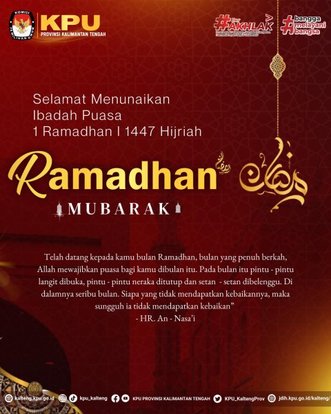 Segenap Jajaran Sekretariat Komisi Pemilihan Umum Provinsi Kalimantan Tengah mengucapkan Selamat Menunaikan Ibadah Puasa Ramadhan 1447 Hijriah. “Hai orang-orang yang beriman, diwajibkan atas kamu berpuasa sebagaimana diwajibkan atas orang-orang sebelum agar kamu bertakwa.” (QS. Al-Baqarah: 183) Marhaban Ya Ramadhan! Ramadhan adalah waktu terbaik untuk mendekatkan diri kepada Allah dan memperbanyak kebaikan. Mohon maaf lahir dan batin. Selamat menunaikan ibadah puasa! ....