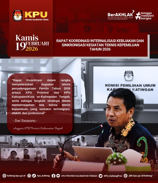 Komisi Pemilihan Umum Provinsi Kalimantan Tengah melaksanakan Rapat Koordinasi Internalisasi dan Sinkronisasi Kegiatan Teknis Kepemiluan Tahun 2026, bertempat di Aula RPP KPU Provinsi Kalimantan Tengah pada Kamis, 19 Februari 2026. Pada kesempatan ini hal yang disampaikan ialah rencana kerja pada Bagian Teknis pada Tahun 2026 dan juga Informasi terkait dengan penyusunan Daerah Pemilihan sebagai informasi awal dari KPU RI yang disampaikan melalui KPU Provinsi untuk KPU Kabupaten/Kota Se-Kalimantan Tengah. Kegiatan ini diikuti sebanyak 28 peserta yang membidangi Divisi Teknis Penyelenggaraan Pemilu dan Kepala Sub Bagian KPU Kabupaten/Kota Se-Kalimantan Tengah. Sambutan sekaligus pembuka dilakukan oleh Anggota Divisi Teknis Penyelenggaraan Pemilu KPU Provinsi Kalimantan Tengah, Dwi Swasono dilanjut dengan arahan dari Anggota Divisi Perencanaan, Data, dan Informasi KPU Provinsi Kalimantan Tengah, Wawan Wiraatmaja. Moderator kegiatan adalah Toni Sadoso Saputra. ....