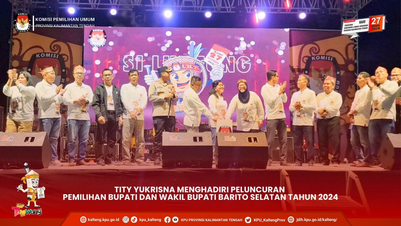 Anggota Komisi Pemilihan Umum Provinsi Kalimantan Tengah Divisi Hukum dan Pengawasan Tity Yukrisna menghadiri Peluncuran Pemilihan Bupati dan Wakil Bupati Kabupaten Barito Selatan Tahun 2024, bertempat di Stadion Batuah Buntok pada Rabu, 29 Mei 2024. Peluncuran dihadiri oleh Asisten II Setda Barito Selatan Rahmat Nuryadin, SH., MH, unsur Pimpinan DPRD, Forkopimda diantaranya Kapolres Barito Selatan, Dandim 1012 Buntok, serta jajaran KPU Kabupaten Barito Selatan dan Komisi Pemilihan Umum Kabupaten/ Kota se - Kalimantan Tengah.