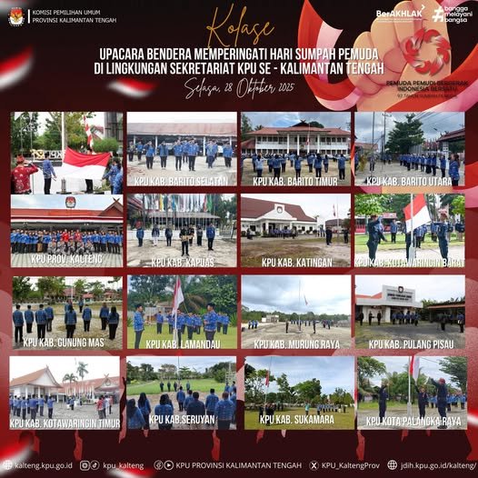 Semangat Sumpah Pemuda terus membara di Bumi Tambun Bungai, dalam memperingati Hari Sumpah Pemuda KPU yang berada di 14 Kabupaten dan 1 Kota di Kalimantan Tengah melaksanakan Upacara Peringatan Hari Sumpah Pemuda ke-97 Tahun 2025 pada hari Selasa, 28 Oktober 2025.