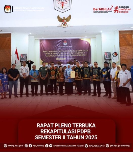 Komisi Pemilihan Umum Provinsi Kalimantan Tengah melaksanakan Rapat Pleno Terbuka Rekapitulasi Pemutakhiran Data Pemilih Berkelanjutan (PDPB) Semester II Tahun 2025 tingkat Provinsi Kalimantan Tengah, bertempat di Aula Palampang Tarung, Kamis (11/12/2025).