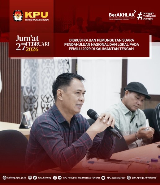 Komisi Pemilihan Umum Provinsi Kalimantan Tengah melaksanakan Kegiatan Diskusi Kajian Pemungutan Suara Pendahuluan Nasional dan Lokal Pada Pemilu 2029 di Kalimantan Tengah, bertempat di Ruang Ketua KPU Provinsi Kalimantan Tengah pada Jumat, 27 Februari 2026.