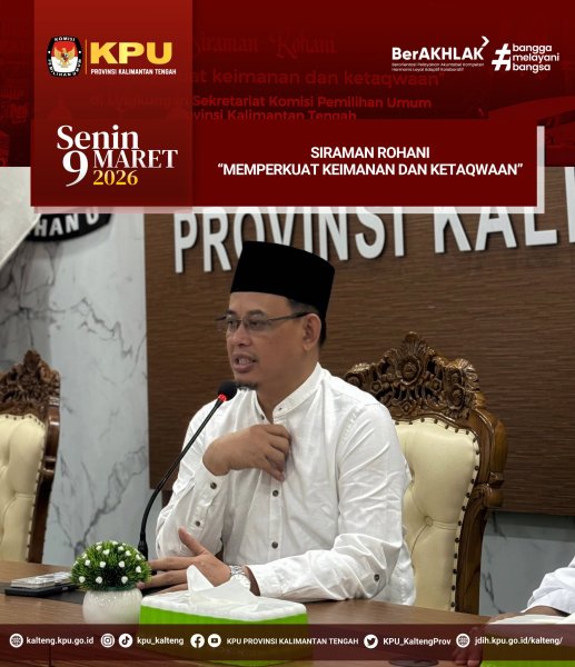 Komisi Pemilihan Umum Provinsi Kalimantan Tengah melaksanakan kegiatan Siraman Rohani dengan tema “Memperkuat Keimanan dan Ketaqwaan” yang bertempat di Aula RPP KPU Provinsi Kalimantan Tengah pada Senin, 10 Maret 2026.