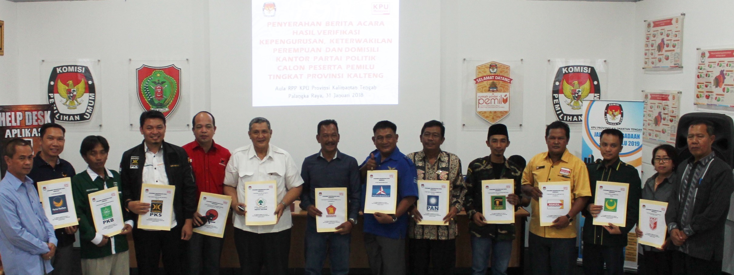 Palangka Raya - Rabu (31/1) KPU Provinsi Kalimantan Tengah melaksanakan kegiatan dalam rangka penyampaikan hasil verifikasi kepengurusan, keterwakilan perempuan dan keberadaan kantor Partai Politik Tingkat Provinsi Kalimantan Tengah pasca putusan Mahkamah Konstitusi (MK). Penyerahan hasil verifikasi tersebut dilaksanakan di ruang aula Rumah Pintar Pemilu (RPP), Jalan Jenderal Sudirman No. 04 Palangka Raya. Penyerahan hasil verifikasi dihadiri oleh Bawaslu Provinsi Kalimantan Tengah, Tim Verifikator Provinsi Kalimantan Tengah serta DPD/DPW Partai Politik, yaitu :1. Nasional Demokrat (NasDem), 2. Partai Kebangkitan Bangsa (PKB), 3. Partai Keadilan Sejahtera (PKS), 4. Partai Demokrasi Indonesia Perjuangan (PDI-P), 5. Partai Golongan Karya (Golkar), 6. Partai Gerakan Indonesia Raya (Gerindra), 7. Partai Demokrat, 8. Partai Amanat Nasional (PAN), 9. Partai Persatuan Pembangunan (PPP), 10. Partai Hati Nurani Rakyat (Hanura), 11. Partai Bulan Bintang (PBB), 12. Partai Keadilan Sejahtera (PKS). Acara dibuka langsung oleh Ketua KPU Provinsi Kalimantan Tengah, dilanjutkan pembacaan hasil verifikasi kepengurusan, keterwakilan perempuan dan keberadaan kantor Partai Politik oleh Sepmiwawalma (anggota KPU Provinsi Kalimantan Tengah Divisi Hukum dan Pengawasan). Selanjutnya penyerahan Berita Acara hasil verifikasi kepengurusan, keterwakilan perempuan dan keberadaan kantor kepada perwakilan 12 Partai Politik diserahkan oleh Ahmad Syar’i (Ketua KU Provinsi Kalimantan Tengah) dan didampingi oleh anggota KPU Provinsi Kalimantan Tengah serta disaksikan langsung oleh Satriadi (Ketua Bawaslu Provinsi Kalimantan Tengah). Av. Posted in Berita on Feb 01, 2018