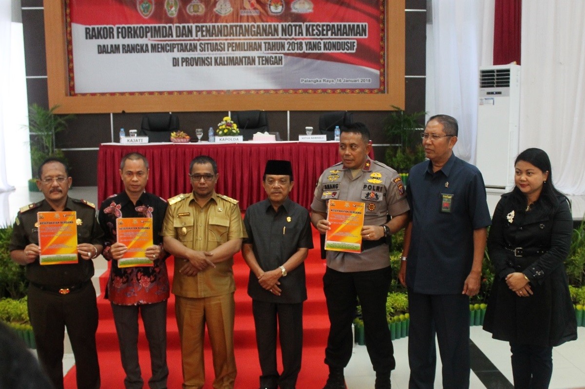 Palangka Raya - Dalam menghadapi berbagai permasalahan hukum sengketa Pemilihan Umum Kepala Daerah sepuluh kabupaten dan satu kota Se-Kalimantan Tengah Tahun 2018, dilaksanakan Rakor FORKOMINDA dan Penandatangan MoU, di Aula Graha Bhayangkara Polda Kalteng, Selasa 16/01/2018. Peserta terdiri dari unsur Kejaksaan Tinggi, Kejaksaan Negeri Kabupaten/Kota, Bawaslu Provinsi, Panwaslu Kabupaten/Kota, KPU Provinsi, KPU Kabupaten/kota, dan Polres Kabupaten/kota. Kapolda Kalimantan Tengah Brigadir Jenderal Polisi Anang Revandoko dalam sambutannya mengatakan kegiatan tersebut dilaksanakan selama dua hari, untuk memberikan gambaran tantangan tugas dan perkembangan strategis yang akan dihadapi, serta menyamakan persepsi visi dan misi yang disepakati dan akan digunakan sebagai pedoman mewujudkan pelayanan prima dalam penanganan tindak pidana khususnya terkait dengan pidana Pemilihan. Sementara itu Komisioner KPU Provinsi Kalimantan Tengah Divisi Teknis Daan Rismon Pitan, SIP selaku narasumber menyampaikan bahwa Gakkumdu harus mempunyai acuan dan dasar hukum dalam menjalankan tugasnya, antara lain Undang-undang Nomor 1 Tahun 2015, Undang-undang Nomor 8 Tahun 2015, Undang-undang Nomor 10 Tahun 2016, Undang-undang Nomor 7 Tahun 2017, Peraturan KPU, serta surat-surat edaran KPU. Daan Rismon juga memberikan gambaran bahwa potensi permasalahan dalam Tahapan Pilkada 2018 dan dinamikanya, antara lain ada empat tahapan yaitu pada tahapan pencalonan, masa kampanye, hari pemungutan suara dan saat rekapitulasi hasil perhitungan suara. Pada kesempatan itu dilakukan penandatanganan Nota Kesepahaman antara Kejaksaan Tinggi Kalteng, Polda Kalteng dan Bawaslu Provinsi Kalteng dalam rangka menciptakan situasi pemilihan umum tahun 2018 yang kondusif di provinsi Kalimantan Tengah. Turut hadir Wakil Gubernur Kalimantan Tengah Habib Said Ismail, Wakil Ketua DPRD Provinsi Kalimantan Tengah Abdul Razak, Plh Ketua KPU Provinsi Kalimantan Tengah Sepmiwawalma.(mfz18)