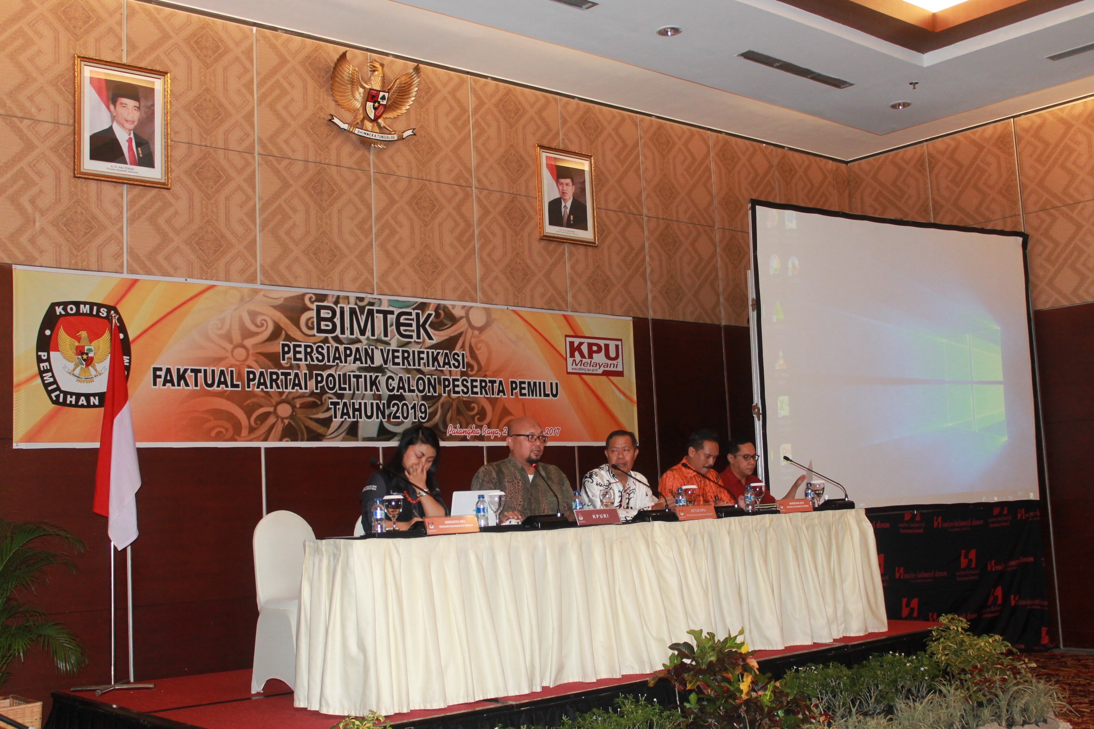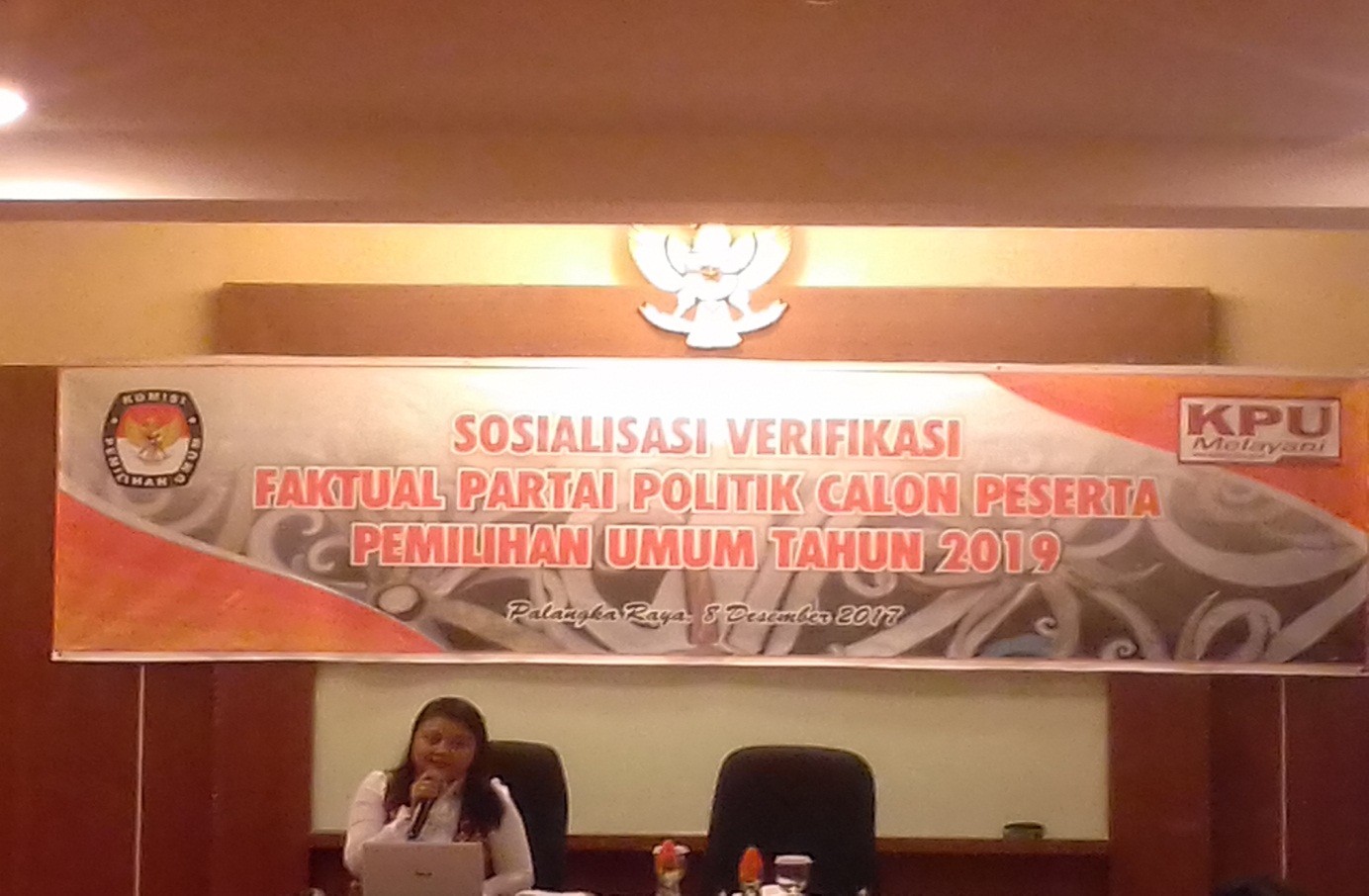 Palangka Raya - Komisi Pemilihan Umum Provinsi Kalimantan Tengahmelaksanakan kegiatan Sosialisasi Verifikasi Faktual Partai Politik Calon Peserta Pemilihan Umum Tahun 2019, Jum’at (8/12/2017). Hadir padakegiatan Sosialisasi Verifikasi Faktual Partai Politik Calon Peserta Pemilihan Umum Tahun 2019 yang bertempat di Hotel Aquarius Boutique Hoteldan dimulai pukul 14.30 WIB iniparapengurusPartaiPolitik, tercatat sebanyak 21 Parpol yang hadir, sedangkan 2 Parpol tidak hadir. Sepmiwawalma Plh. Ketua KPU Provinsi Kalimantan Tengahyang sekaligus sebagai narasumber menyatakan bahwa“sesuai Peraturan KPU Nomor 7 Tahun 2017, KPU Provinsi Kalimantan Tengah akan melaksanakan verifikasi faktual kepada Parpol Tingkat Provinsi terhadap kebenaran dan keabsahan meliputi : 1) Jumlah dan susunan kepengurusan Partai Politik Tingkat Provinsi berdasarkan Keputusan Kepengurusan Parpol Tingkat Pusat tentang susunan kepengurusan Partai Politik Tingkat Provinsi; 2) Kepengurusan Partai Politik Tingkat Provinsi dengan memperhatikan 30% keterwakilan perempuan; dan 3) Domisili dan status kantor tetap kepengurusan Partai Politik Tingkat Provinsi yang dilaksanakan pada tanggal 15 s.d 21 Desember 2017”. “Agar Pengurus Parpol Provinsi mengingatkan kepada pengurus Partai Tingkat Kabupaten/Kota untuk mempersiapkan diri dalam verifikasi faktual kepada Parpol tingkat Kabupaten/Kota terhadap kebenaran dan keabsahan meliputi : 1) Jumlah dan susunan kepengurusan Partai Politik Tingkat Kabupaten/Kota berdasarkan Keputusan Kepengurusan Parpol Tingkat Pusat/Provinsi tentang susunan kepengurusan Partai Politik Tingkat Kabupaten/Kota; 2) Kepengurusan Partai Politik Tingkat Provinsi dengan memperhatikan 30% keterwakilan perempuan; 3) Domisili dan status kantor tetap kepengurusan Partai Politik Tingkat Kabupaten/Kota; dan 4) Keanggotaan Parpol paling sedikit 1.000 (seribu) orang atau 1/1.000 (satu per seribu) dari jumlah penduduk pada tingkat Kabupaten/Kota yang akan dilaksanakan tanggal 15 Desember 2017 s.d 4 Januari 2018”. (G.C).