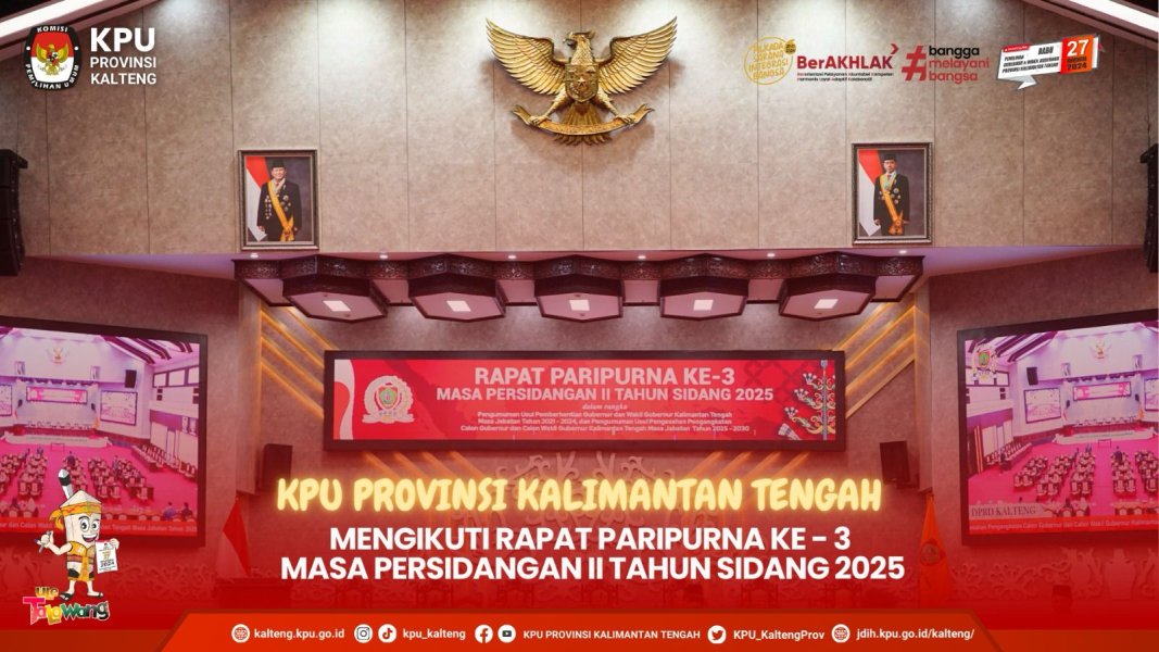 Komisi Pemilihan Umum Provinsi Kalimantan Tengah mengikuti Rapat Paripurna ke - 3 Masa Persidangan II Tahun Sidang 2025 bertempat di Ruang Rapat Paripurna DPRD Provinsi Kalimantan Tengah pada Sabtu, 8 Februari 2025.