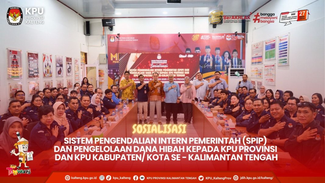 Komisi Pemilihan Umum Provinsi Kalimantan Tengah menggelar Sosialisasi Pengendalian Intern Pemerintah (SPIP) dan Pengelolaan Dana Hibah kepada Komisi Pemilihan Umum Provinsi dan Komisi Pemilihan Umum Kabupaten/ Kota se - Kalimantan Tengah bertempat di Ruang Rumah Pintar Pemilu Komisi Pemilihan Umum Provinsi Kalimantan Tengah pada Sabtu, 25 Januari 2025.