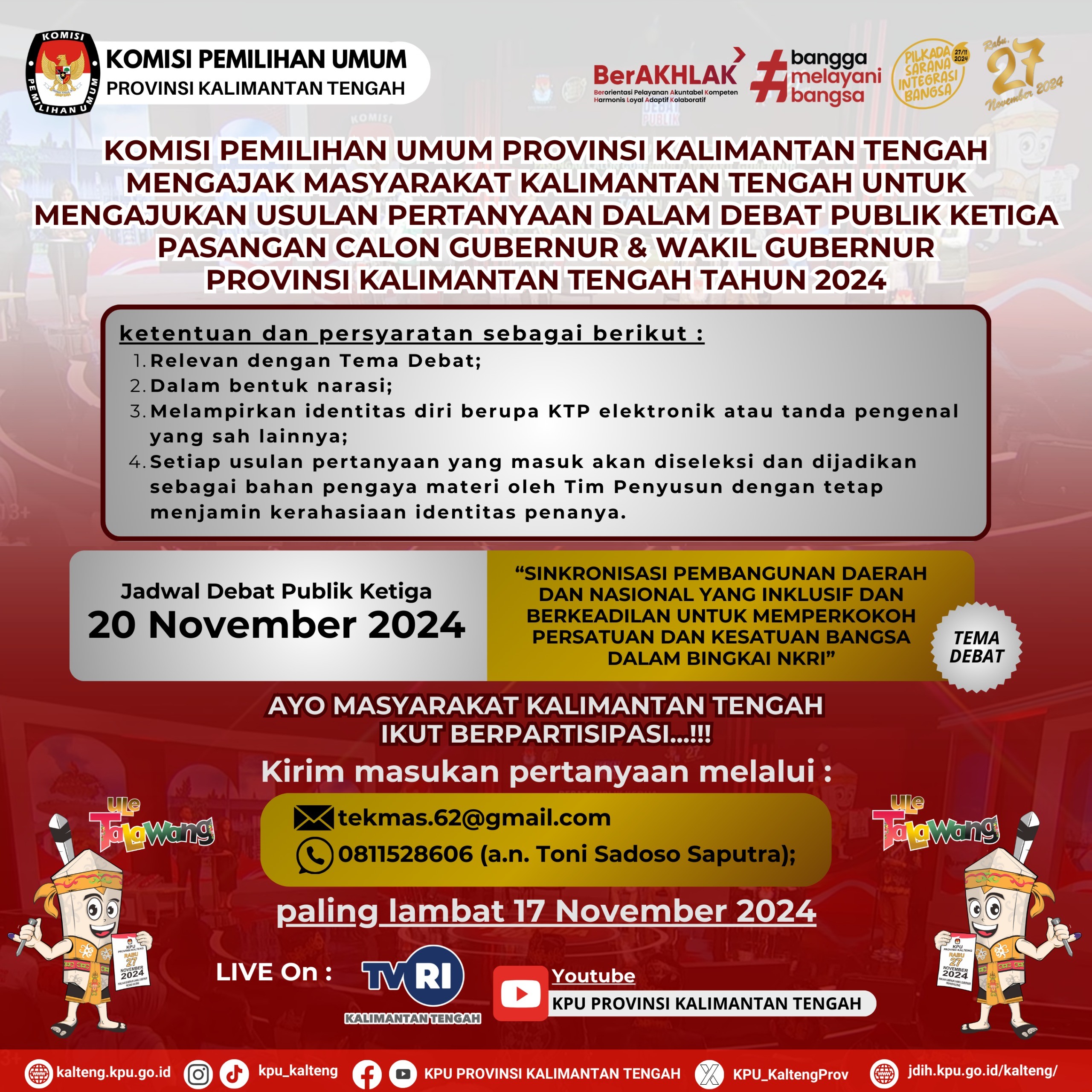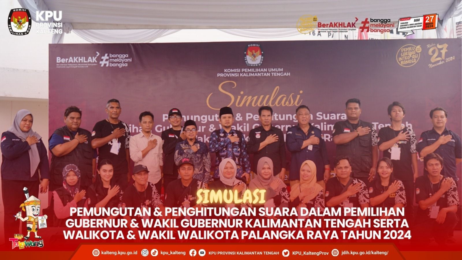 Komisi Pemilihan Umum Provinsi Kalimantan Tengah menggelar Simulasi Pemungutan dan Penghitungan Suara Pemilihan Gubernur dan Wakil Gubernur Kalimantan Tengah serta Walikota dan Wakil Walikota Palangka Raya Tahun 2024 bertempat di Halaman Kantor Komisi Pemilihan Umum Kota Palangka Raya pada Minggu, 10 November 2024. Kegiatan simulasi dibuka oleh Ketua Komisi Pemilihan Umum Provinsi Kalimantan Tengah, Sastriadi. Turut hadir Anggota Komisi Pemilihan Umum Provinsi Kalimantan Tengah, Dwi Swasono, Harmain, dan Tity Yukrisna. Hadir pula Ketua Komisi Pemilihan Umum Kota Palangka Raya, Joko Anggoro dan seluruh Anggota Komisi Pemilihan Umum Kota Palangka Raya. Simulasi ini dihadiri oleh jajaran Forkopimda Provinsi Kalimantan Tengah, Instansi Terkait, Saksi dan Tim Pasangan Calon Gubernur dan Wakil Gubernur Kalimantan Tengah Tahun 2024. Peserta simulasi terdiri dari Anggota KPU Kabupaten/ Kota divisi Teknis Penyelenggara, Kasubag Teknis dan Hukum Komisi Pemilihan Umum Kabupaten/ Kota se - Kalimantan Tengah serta PPK divisi Teknis Penyelenggara se - Kalimantan Tengah.