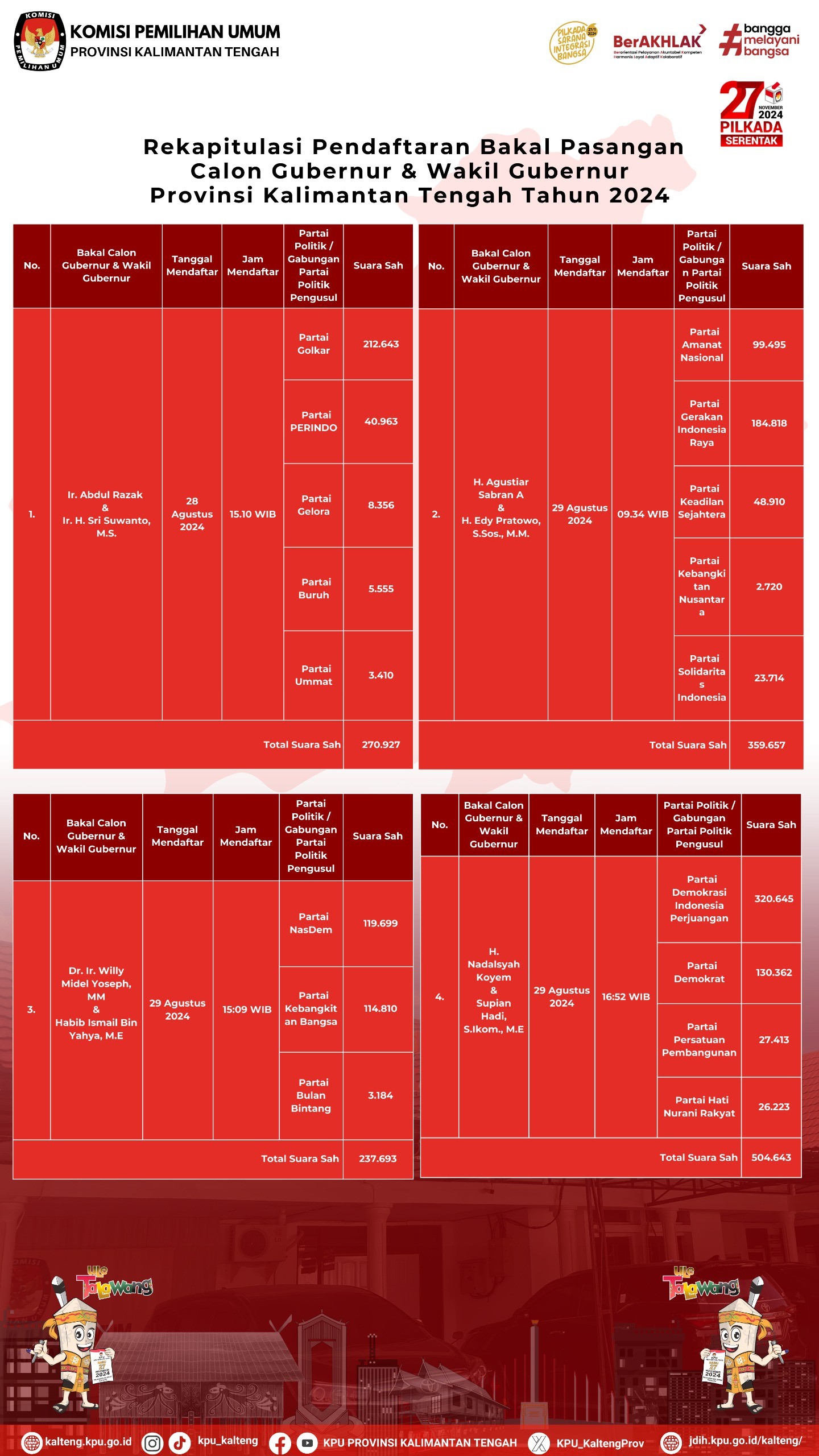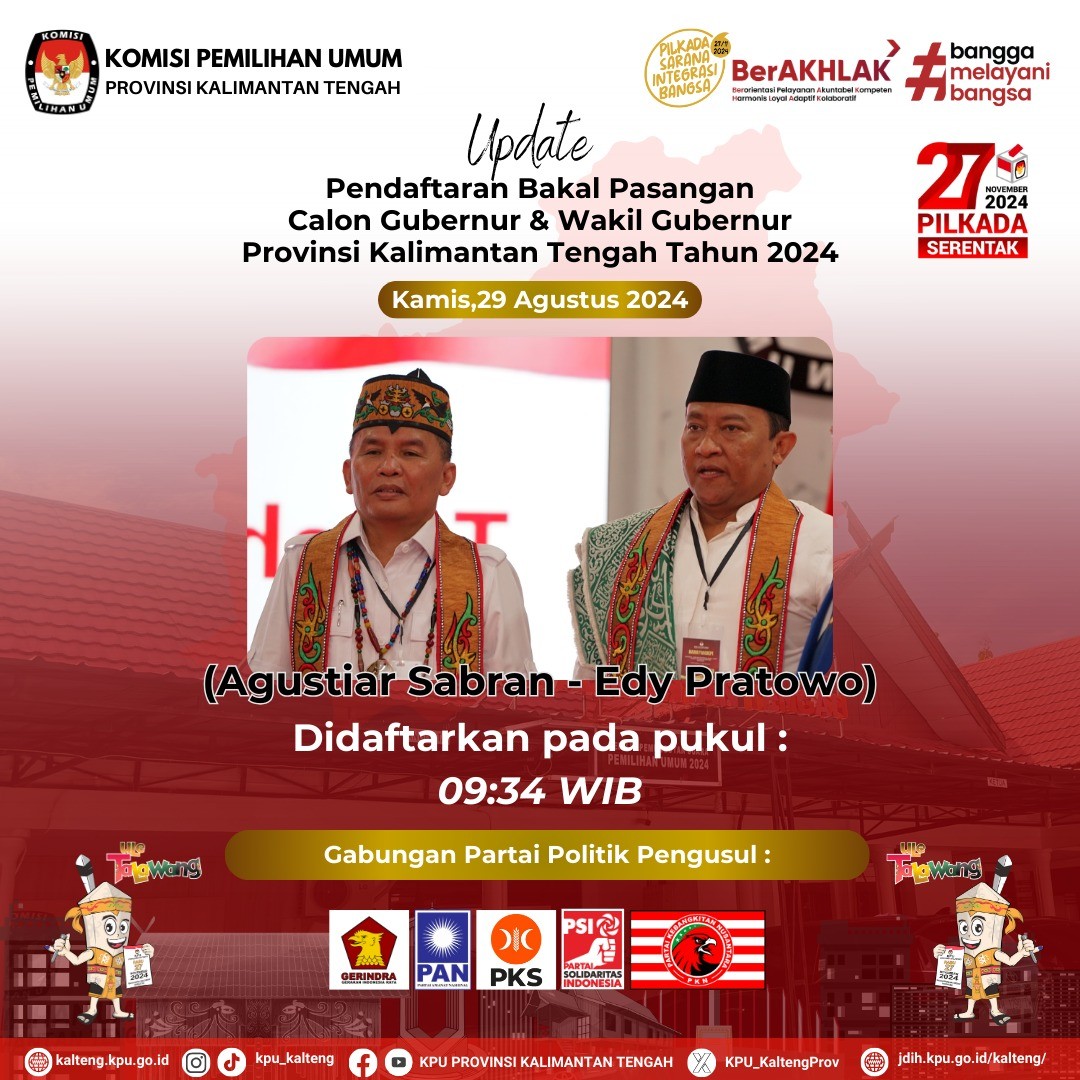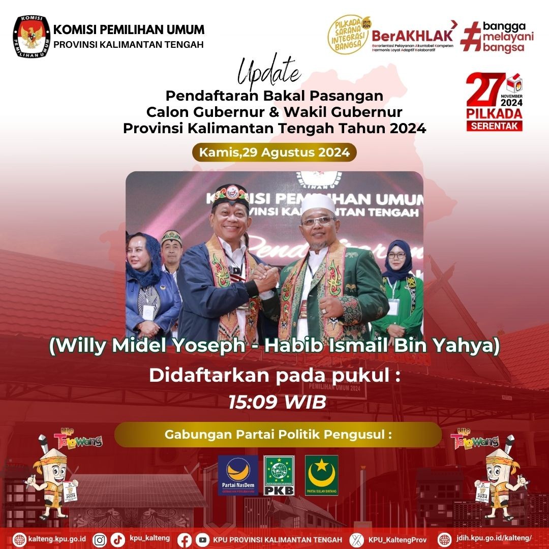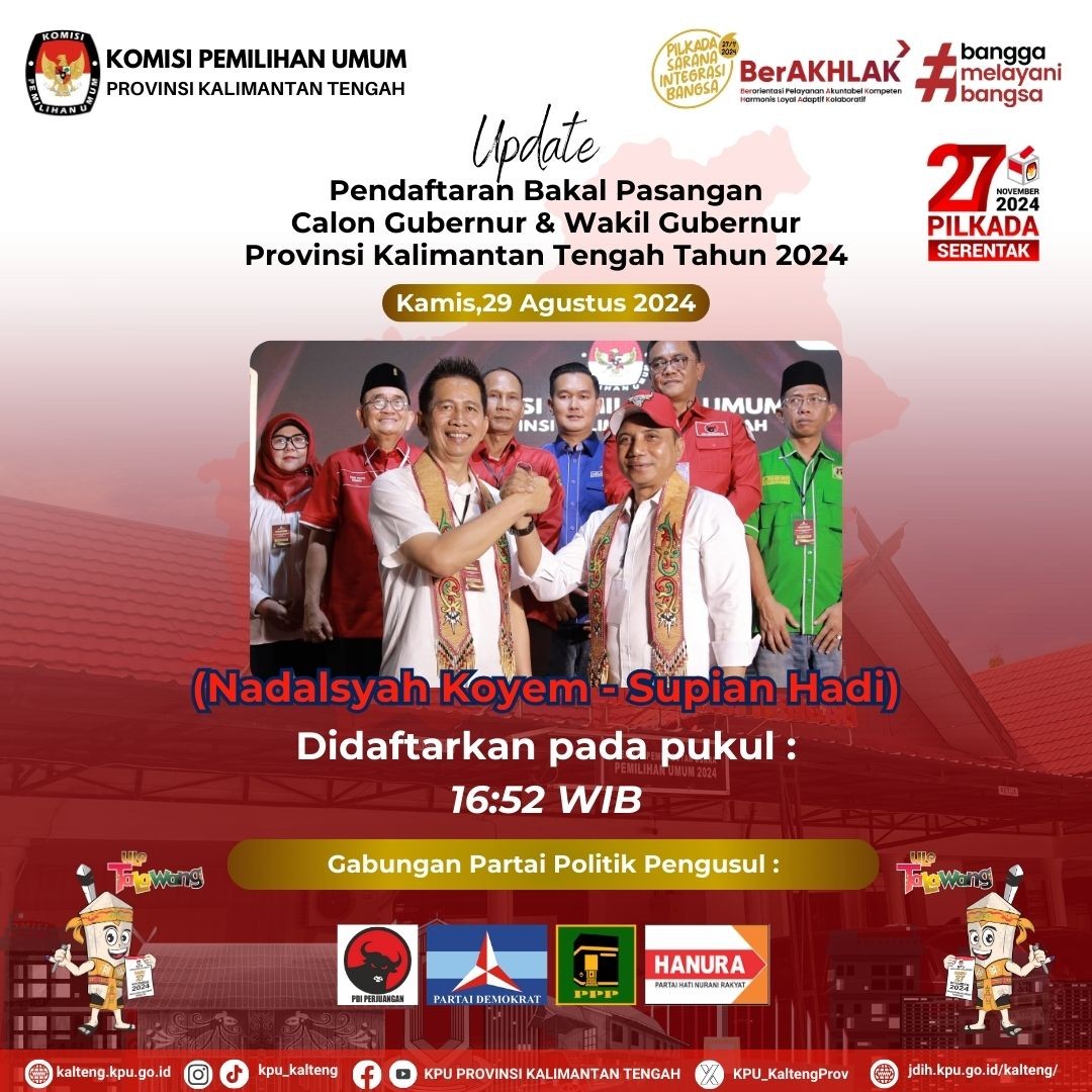 Komisi Pemilihan Umum Provinsi Kalimantan Tengah menerima pendaftaran Bakal Pasangan Calon Gubernur dan Wakil Gubernur Kalimantan Tengah Tahun 2024 H. Nadalsyah Koyem - Supian Hadi, S.Ikom., M.E pada Pukul 16.52 WIB pada Kamis, 29 Agustus 2024.