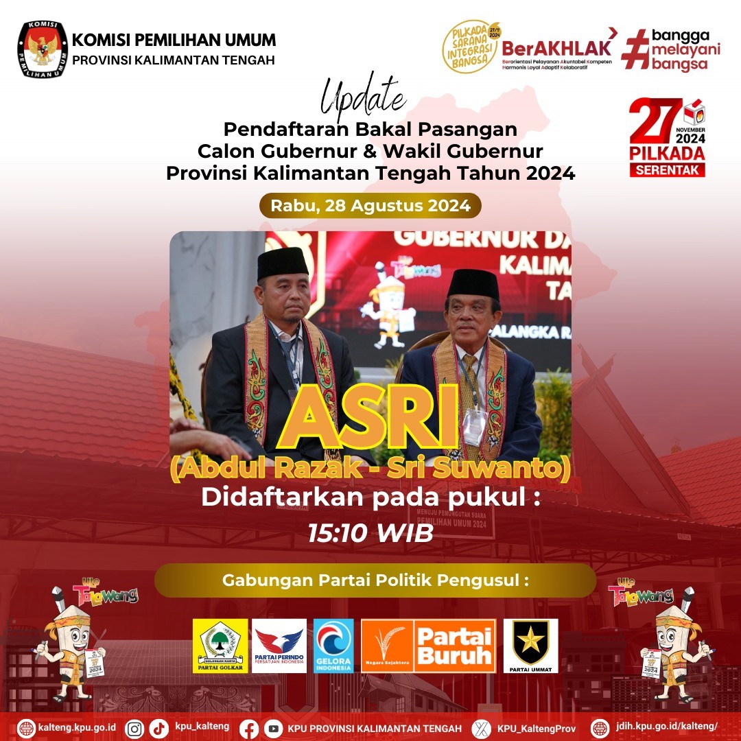 Komisi Pemilihan Umum Provinsi Kalimantan Tengah menerima pendaftaran Bakal Pasangan Calon Gubernur dan Wakil Gubernur Kalimantan Tengah Tahun 2024 H. Agustiar Sabran A, S.IKom – H. Edy Pratowo, S.Sos., MM pada Pukul 09.34 WIB pada Kamis, 29 Agustus 2024.