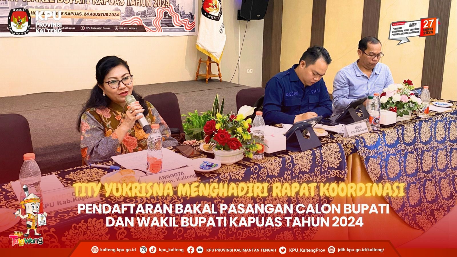 Komisi Pemilihan Umum Provinsi Kalimantan Tengah bersama dengan pihak Rumah Sakit Umum Daerah dr. Doris Sylvanus Palangka Raya melakukan Penandatanganan Perjanjian Kerja Sama Pemeriksaan Kesehatan Bakal Pasangan Calon Gubernur dan Wakil Gubernur, Bupati dan Wakil Bupati, serta Walikota dan Wakil Walikota Kalimantan Tengah Tahun 2024. Bertempat di Ruang Rumah Pintar Pemilu Komisi Pemilihan Umum Provinsi Kalimantan Tengah pada Jumat, 23 Agustus 2024. Selain Komisi Pemilihan Umum Provinsi Kalimantan Tengah yang melakukan Penandatanganan Perjanjian Kerja Sama dengan Rumah Sakit Umum Daerah dr. Doris Sylvanus Palangka Raya, ada beberapa Komisi Pemilihan Umum Kabupaten/ Kota juga yang melakukan Penandatanganan Perjanjian Kerja Sama dengan Rumah Sakit Umum Daerah dr. Doris Sylvanus Palangka Raya, antara lain Komisi Pemilihan Umum Kabupaten Kapuas, Komisi Pemilihan Umum Kabupaten Pulang Pisau, Komisi Pemilihan Umum Kabupaten Barito Selatan, Komisi Pemilihan Umum Kabupaten Barito Timur, Komisi Pemilihan Umum Kabupaten Barito Utara, Komisi Pemilihan Umum Kabupaten Murung Raya, Komisi Pemilihan Umum Kabupaten Katingan, Komisi Pemilihan Umum Kabupaten Seruyan, Komisi Pemilihan Umum Kabupaten Gunung Mas dan Komisi Pemilihan Umum Kota Palangka Raya. Penandatanganan Perjanjian Kerja Sama dihadiri oleh Direktur Rumah Sakit Umum Daerah dr. Doris Sylvanus Palangka Raya Ady Fraditha, S. Kep., Ners. di dampingi Wakil Direktur Pendidikan & Pengembangan Rumah Sakit Maya Magdalena, S.K.M. dan Wakil Direktur Umum dan Keuangan Isranor, S. Sos., MM beserta jajaran Rumah Sakit Umum Daerah dr. Doris Sylvanus Palangka Raya dan Anggota Badan Pengawas Pemilu Provinsi Kalimantan Tengah, Norhalina.