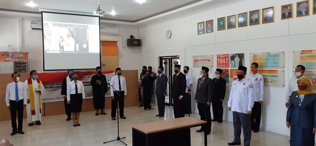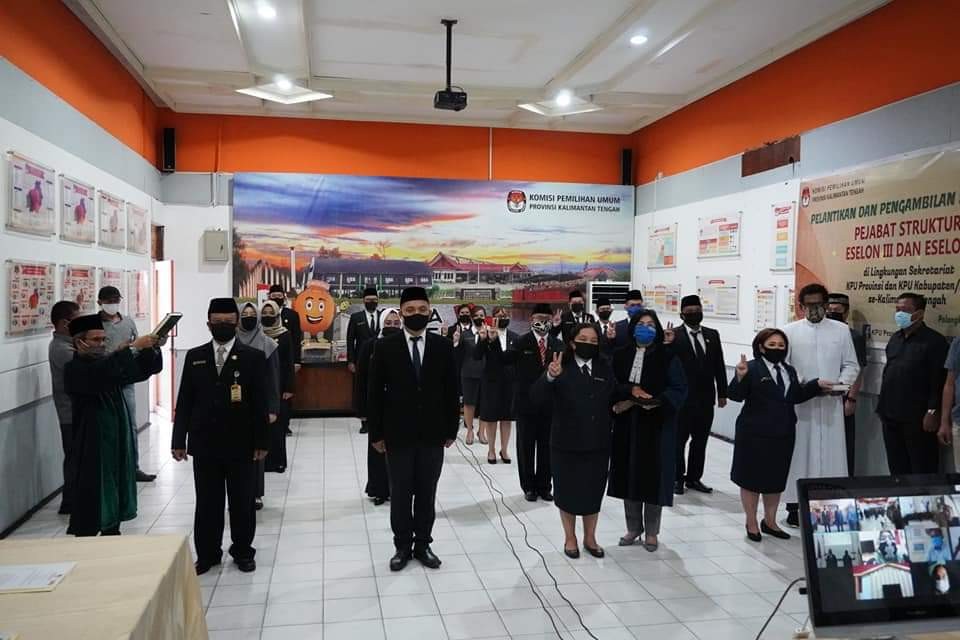Palangka Raya, www.kpukalteng.kpu.go.id – Sekretaris KPU Provinsi Kalimantan Tengah Arief Suja’i melantik 21 (dua puluh satu) orang Pejabat Struktural yang terdiri dari 6 (enam) orang Pejabat Administrator (Eselon III) dan 15 (lima belas) orang Pejabat Pengawas (Eselon IV) di Lingkungan Sekretariat KPU Provinsi Kalimantan Tengah, Selasa (09/06/2020). Acara Pelantikan dan Pengambilan Sumpah/Janji Jabatan yang dimulai pukul 14.00 WIB dilakukan secara langsung di Ruang Rumah Pintar Pemilu (RPP) KPU Provinsi Kalimantan Tengah dan secara daring bagi KPU Kabupaten yang jarak tempuhnya jauh dengan menjalankan protokol kesehatan pencegahan Covid-19. “Saya ucapkan selamat kepada Saudara yang telah dilantik pada hari ini, baik yang promosi jabatan maupun yang mengalami mutasi intern jabatan, ini murni kebutuhan organisasi dengan mempertimbangkan jenjang karir dan masa kerja anda selaku pegawai negeri sipil, besar harapan anda menorehkan dan dicatat dalam tinta emas selama karir saudara. Perlu diingat bahwa Keputusan di KPU lintas sektoral karena pengambilan keputusannya oleh Komisioner atau pengambilan keputusan di KPU yang bersifat matriks, agar saudara segera bekerja dan menyesuaikan suasana kerja yang ada secara cermat dimana sebentar lagi kita akan memulai tahapan Pilkada lanjutan 2020 yang menurut rancangan yang telah ada akan dimulai tanggal 15 Juni 2020, dimana Kalimantan Tengah sendiri akan melaksanakan Pemilihan Gubernur dan Wakil Gubernur Kalimantan Tengah lanjutan dan Pemilihan Bupati dan Wakil Bupati Kotawaringin Timur lanjutan, laksanakan konsolidasi internal serta koordinasi dengan baik dan diingatkan bahwa bekerja tidak asal selesai bekerja, pemimpin harus bekerja dengan inspirasi, diskusi bahkan berani mengeksekusi dengan segala resikonya” tutur Arief Suja’i. “Dalam bekerja ada 3 (tiga) prinsip yang harus kita pegang yaitu Transparansi, Integritas dan Soliditas. Dalam bekerja kita harus ingat yang terutama adalah integritas, karena integritas meliputi 2 (dua) hal yaitu kinerja serta kepribadian yang harus dilaksanakan secara berimbang atau balance” pungkas Arief Suja’i. Adapun Pejabat Struktural Eselon III dan Eselon IV yang dilantik berdasarkan Keputusan Sekretaris Jenderal KPU RI dan Keputusan Sekretaris KPU Provinsi Kalimantan Tengah sebagai berikut :