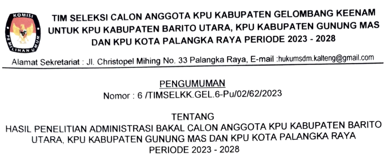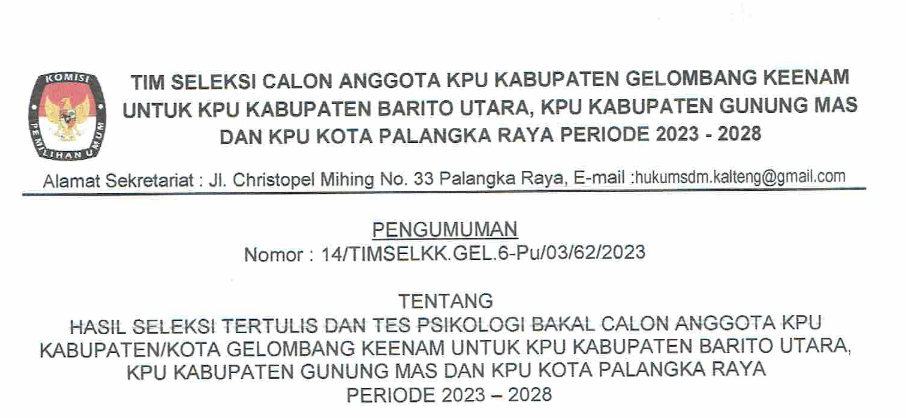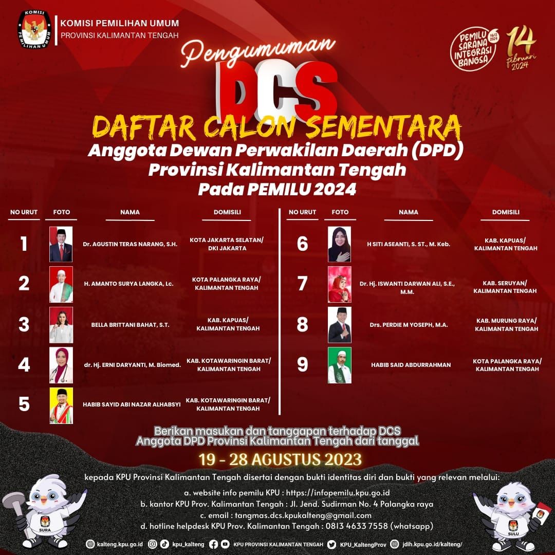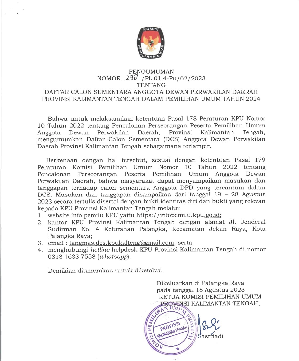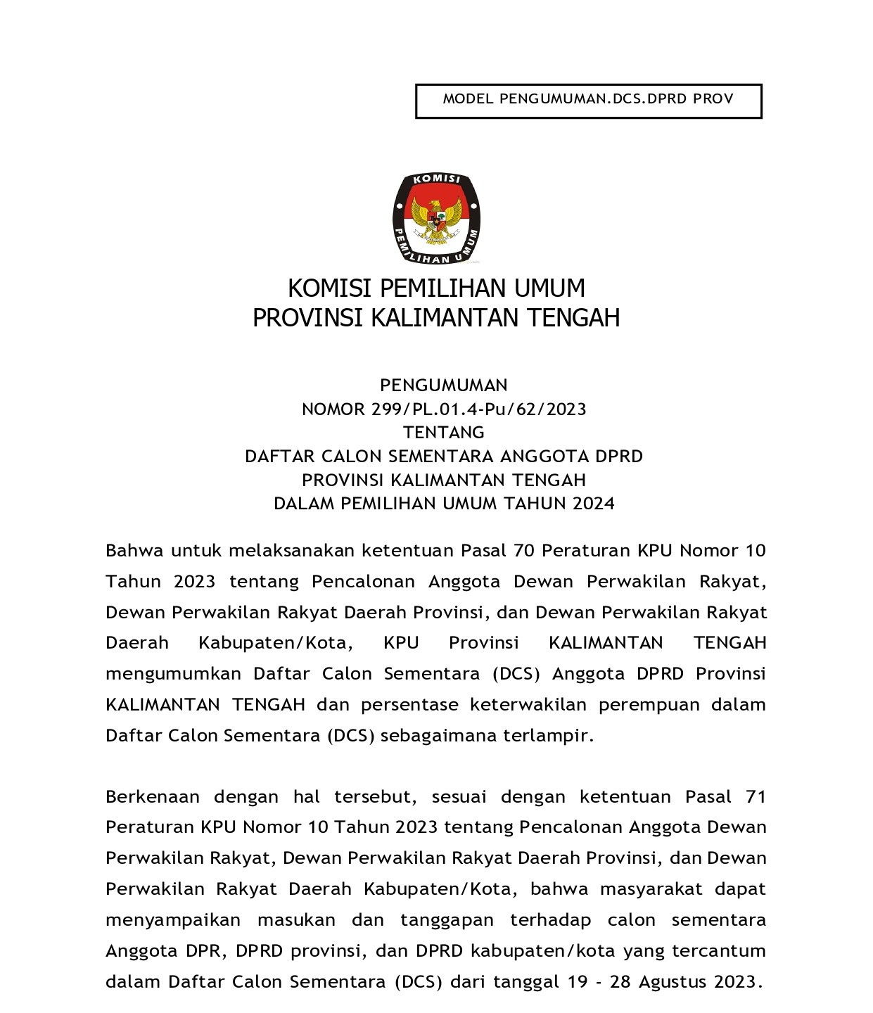 Bahwa untuk melaksanakan ketentuan Pasal 70 Peraturan KPU Nomor 10 Tahun 2023 tentang Pencalonan Anggota Dewan Perwakilan Rakyat, Dewan Perwakilan Rakyat Daerah Provinsi dan Dewan Perwakilan Rakyat Daerah Kabupaten/ Kota, KPU Provinsi Kalimantan Tengah mengumumkan Daftar Calon Sementara (DCS) Anggota Dewan Perwakilan Rakyat Daerah Provinsi Kalimantan Tengah dan persentase keterwakilan perempuan.