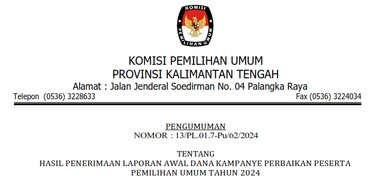 Komisi Pemilihan Umum Provinsi Kalimantan Tengah mengumumkan Hasil Penerimaan Laporan Awal Dana Kampanye Peserta Pemilihan Umum Tahun 2024 Calon Anggota Dewan Perwakilan Daerah (DPD). Untuk informasi lebih lengkap, KLIK DI SINI.