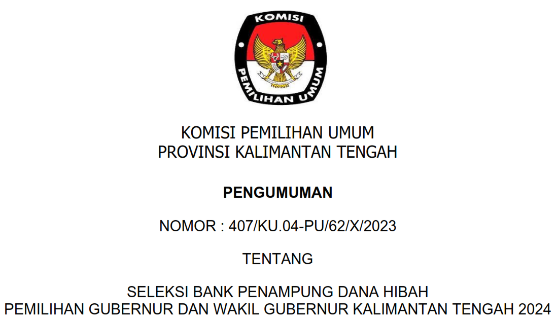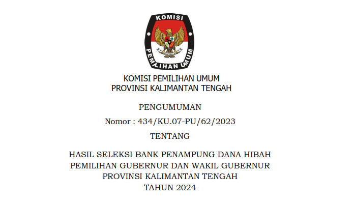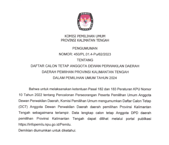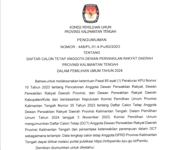 Komisi Pemilihan Umum Provinsi Kalimantan Tengah pada tanggal 3 November 2023 mengumumkan Daftar Calon Tetap (DCT) Anggota Dewan Perwakilan Rakyat Daerah (DPRD) Provinsi Kalimantan Tengah dalam Pemilihan Umum Tahun 2024.