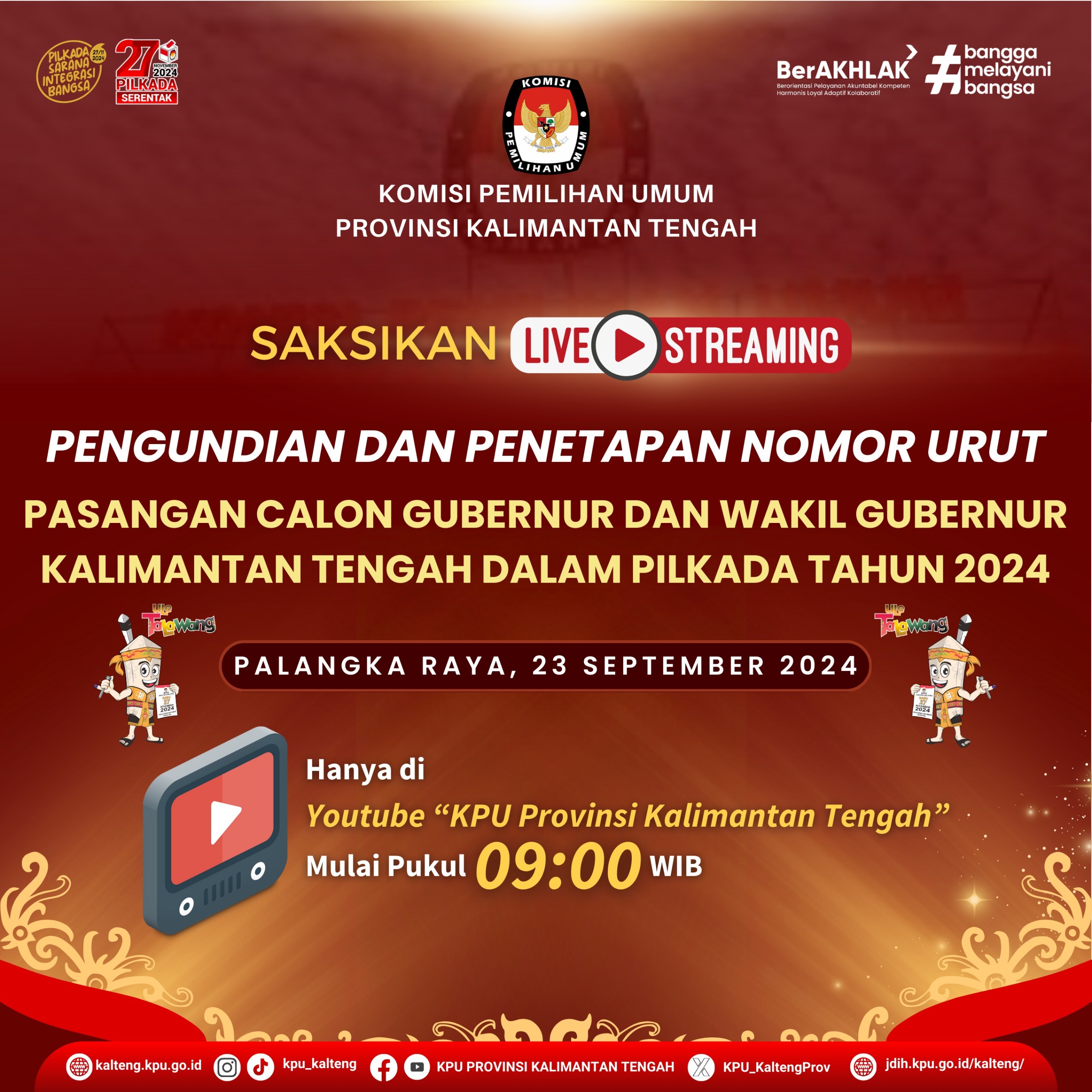 Saksikan live streaming Pengundian dan Penetapan Nomor Urut Pasangan Calon Gubernur dan Wakil Gubernur Kalimantan Tengah dalam Pemilihan Serentak Tahun 2024 hanya di kanal Youtube KPU Provinsi Kalimantan Tengah.