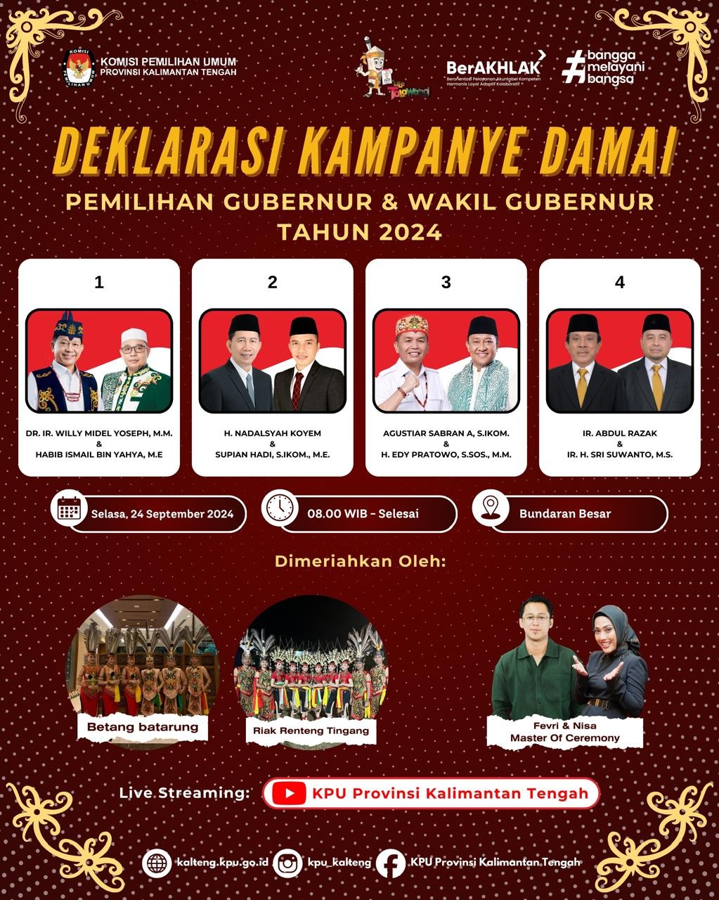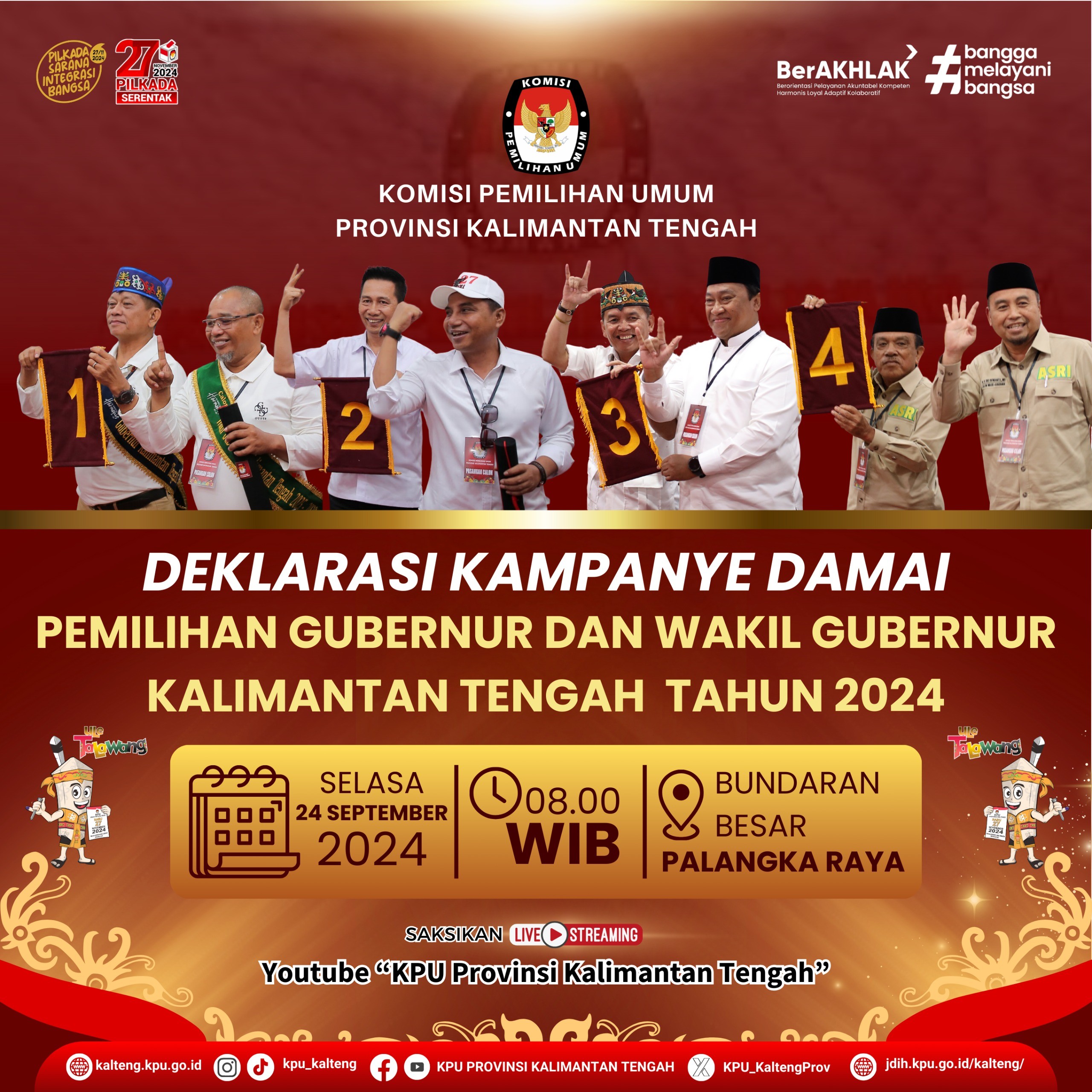 Saksikan dan meriahkan Deklarasi Kampanye Damai Pemilihan Gubernur dan Wakil Gubernur Kalimantan Tengah Tahun 2024 hanya di kanal youtube KPU Provinsi Kalimantan Tengah.
