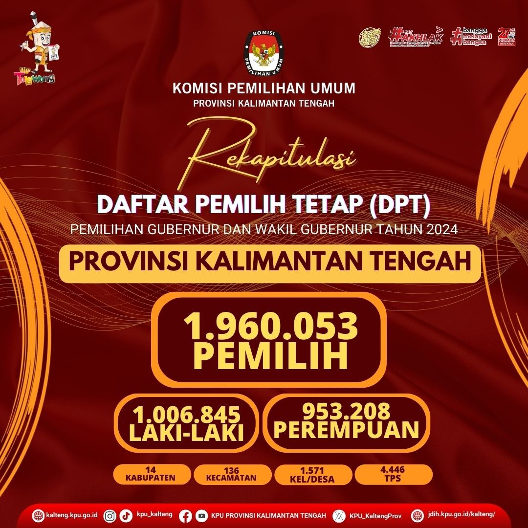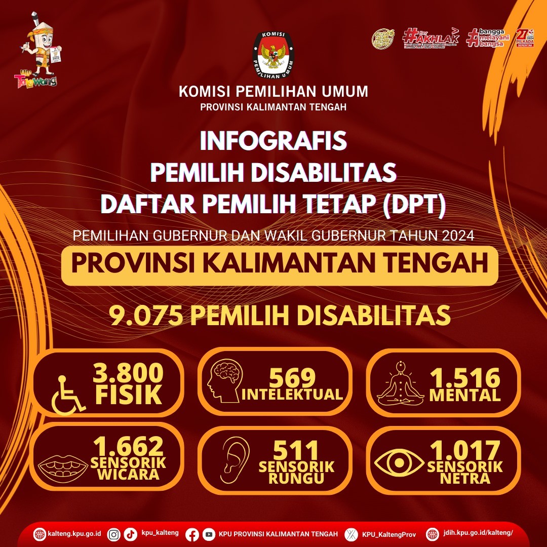 Berikut disampaikan Rekapitulasi Pemilih Disabilitas Daftar Pemilih Tetap (DPT) pada Pemilihan Gubernur dan Wakil Gubernur Tahun 2024 Provinsi Kalimantan Tengah.