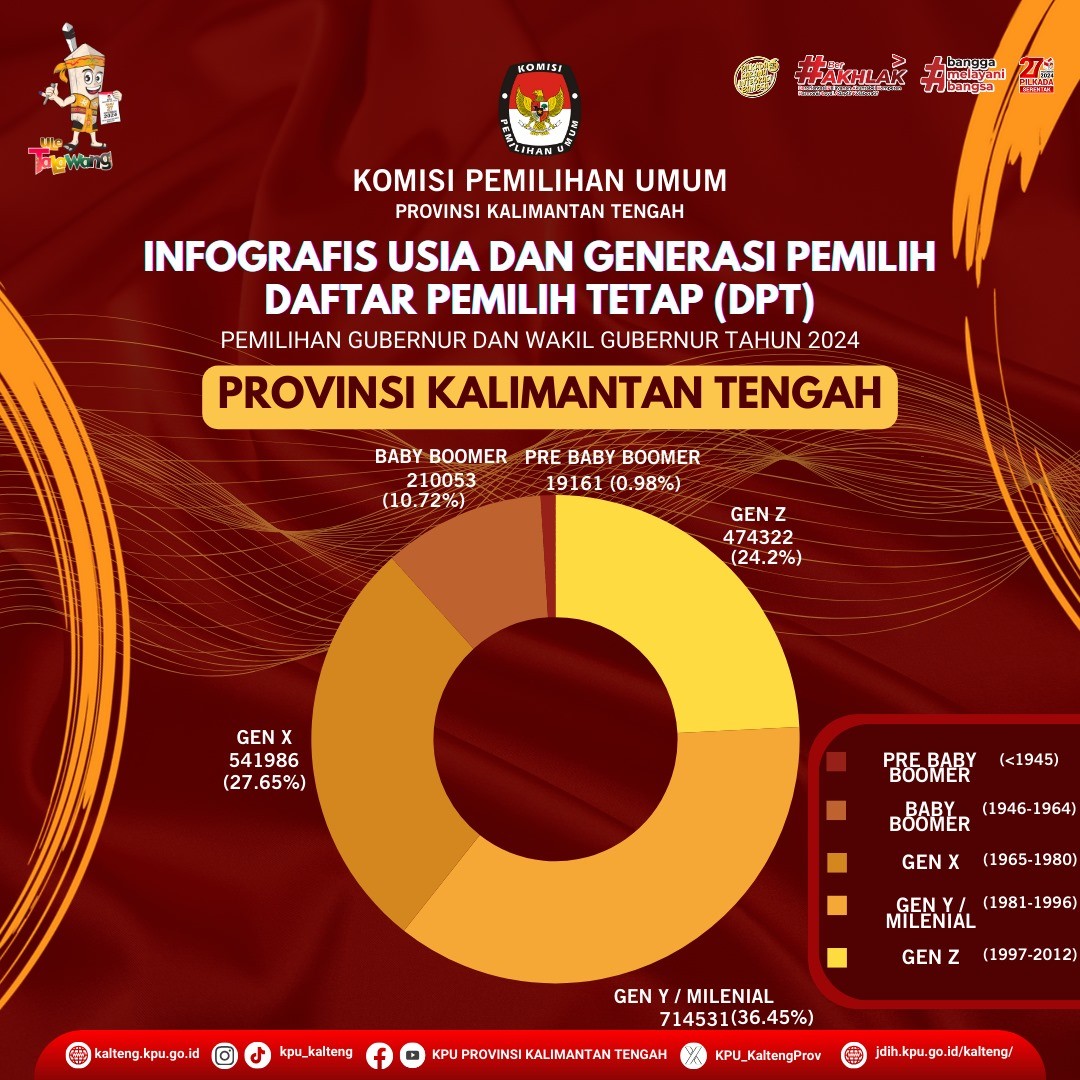 Berikut disampaikan Infografis Usia dan Generasi Daftar Pemilih Tetap (DPT) pada Pemilihan Gubernur dan Wakil Gubernur Tahun 2024 Provinsi Kalimantan Tengah.