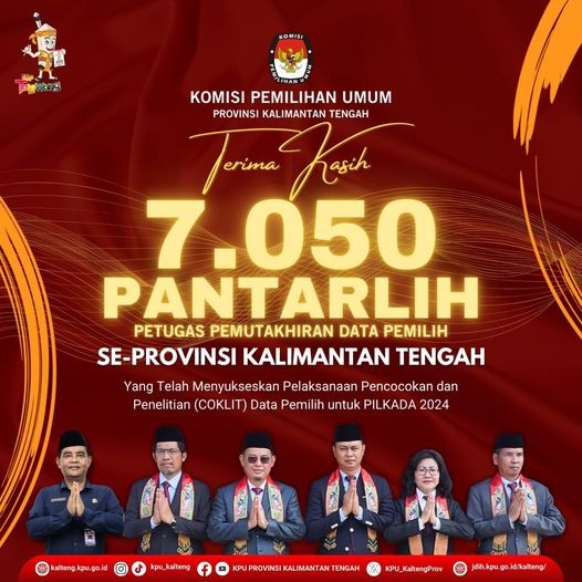 Komisi Pemilihan Umum Provinsi Kalimantan Tengah menyampaikan ucapan terima kasih kepada 7.050 petugas Pantarlih di seluruh Kalimantan Tengah. Terima kasih atas dedikasi dan kerja kerasnya dalam melaksanakan Pencocokan dan Penelitian (Coklit) pada Pemilihan Serentak Tahun 2024.